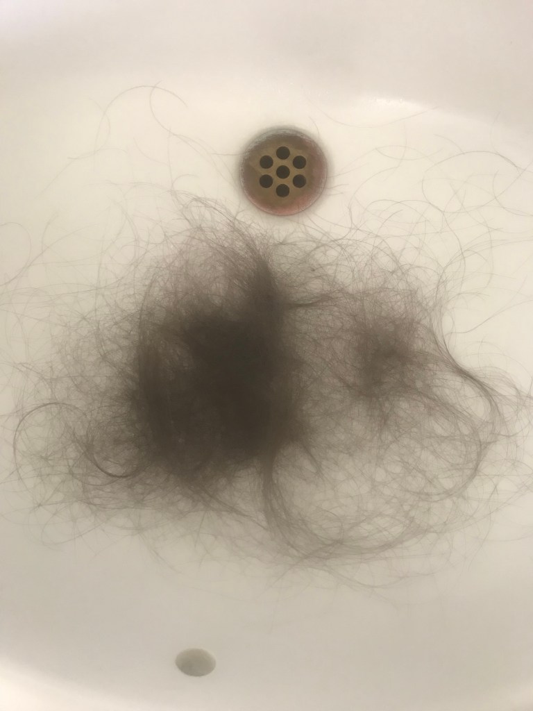 I ended up cutting 8 inches an off in the hospital and donated it. The chop also helped me transition to being bald. I noticed a few hairs starting to fall out ten days after chemo. It wasn’t anything drastic like the clumps I’d seen people pull out in videos.